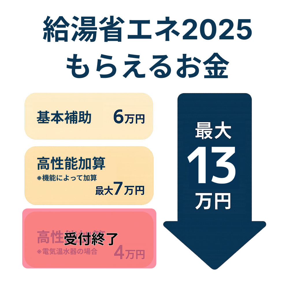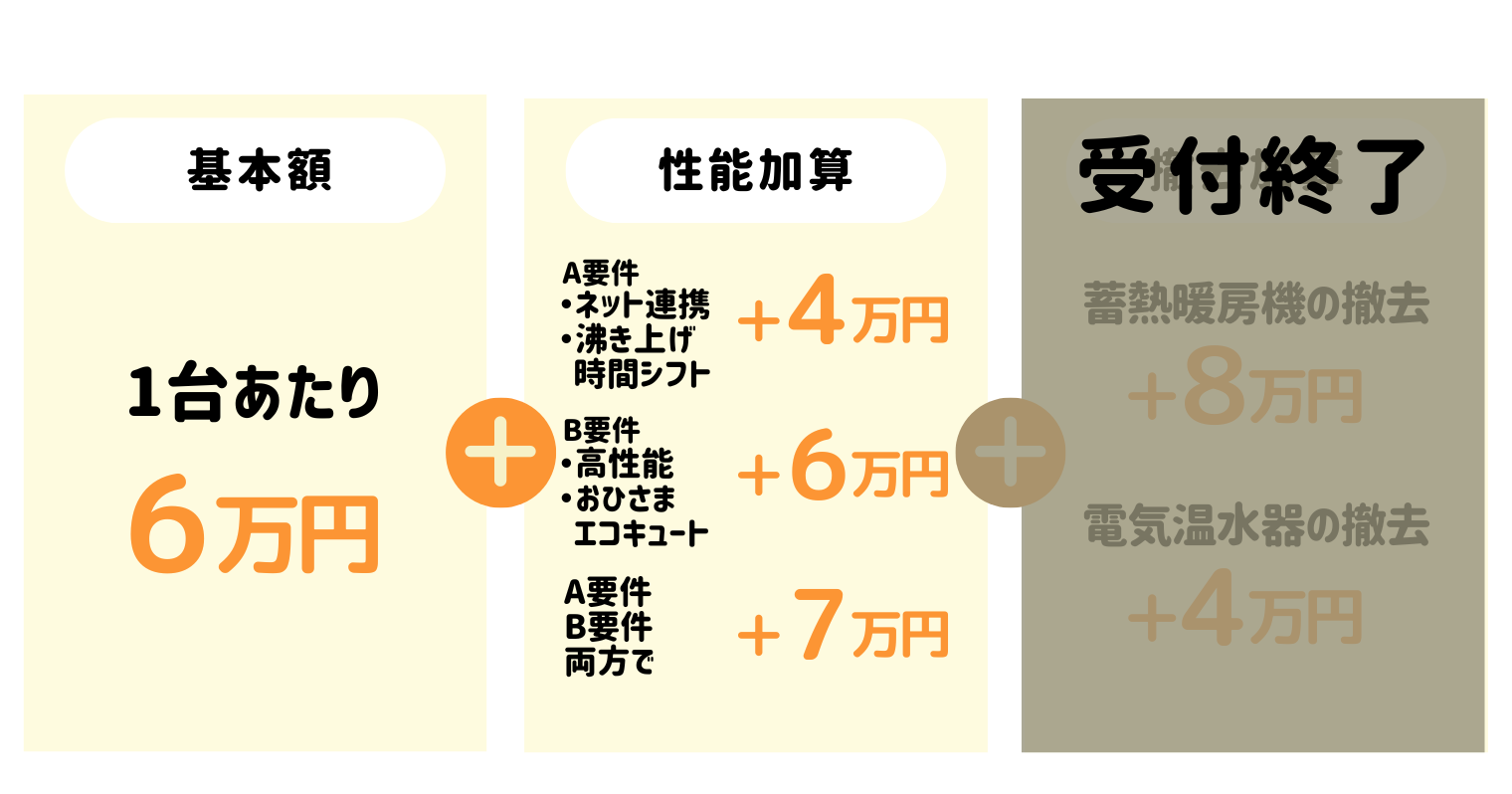記事公開当初、基本額13万円に「電気温水器の撤去費用(4万円)」が加算され最大17万円となっていましたが、2025年11月現在、撤去費用の加算補助が予算上限に達し受付を終了したため、現在の最大額は13万円です。