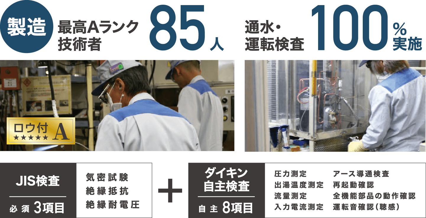 ダイキンでは、社内認定制度を設け、技術ランクの高さによって 扱える作業を限定しています。例えば、貯湯タンクのろうづけ(溶接)は、 最高Aランクの技術者 だけで行います。