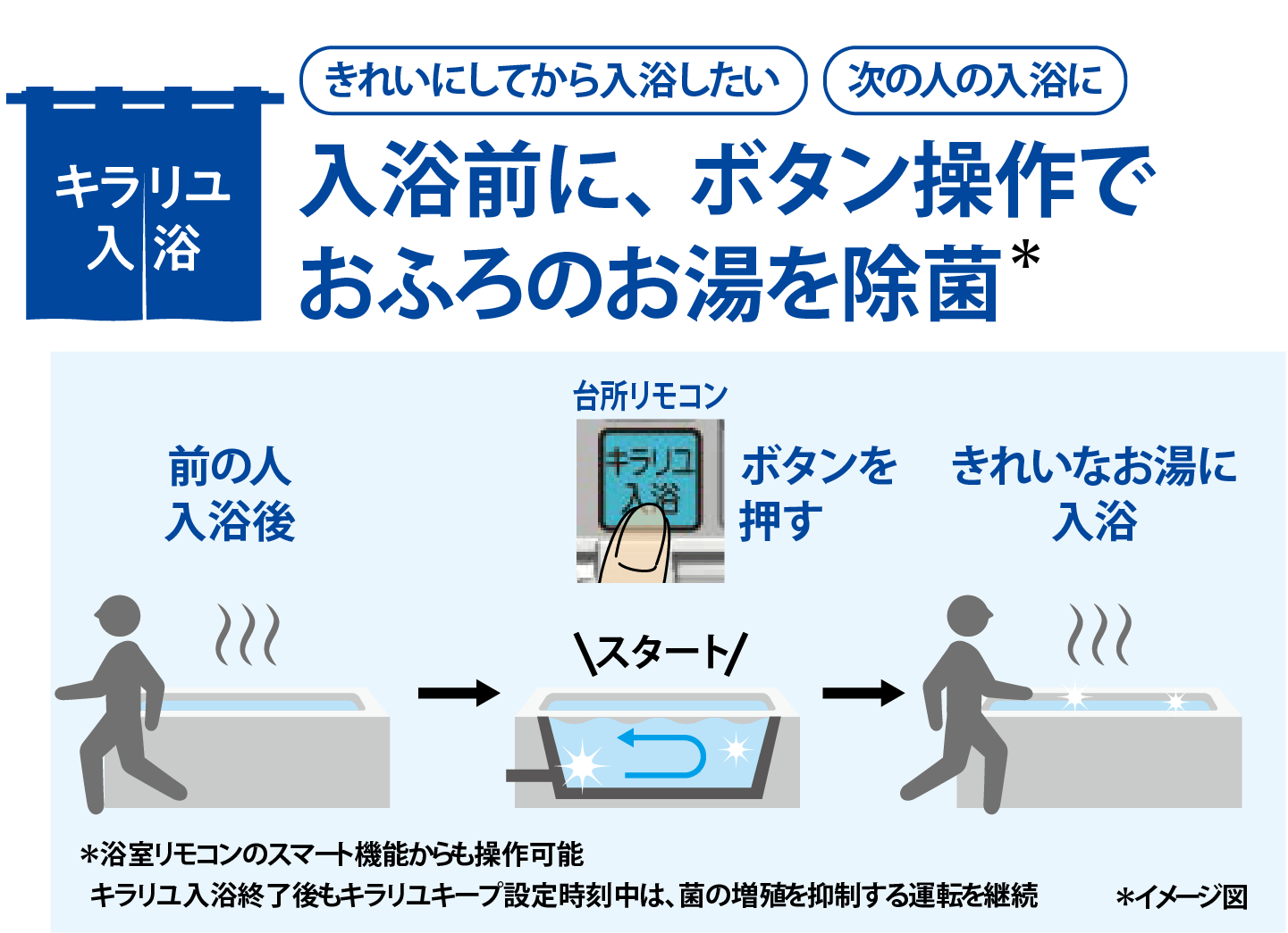 キラリユ入浴は、台所リモコンの「キラリユ入浴」ボタンを押すだけで深紫外線を連続照射を開始し、お風呂のお湯を除菌します。