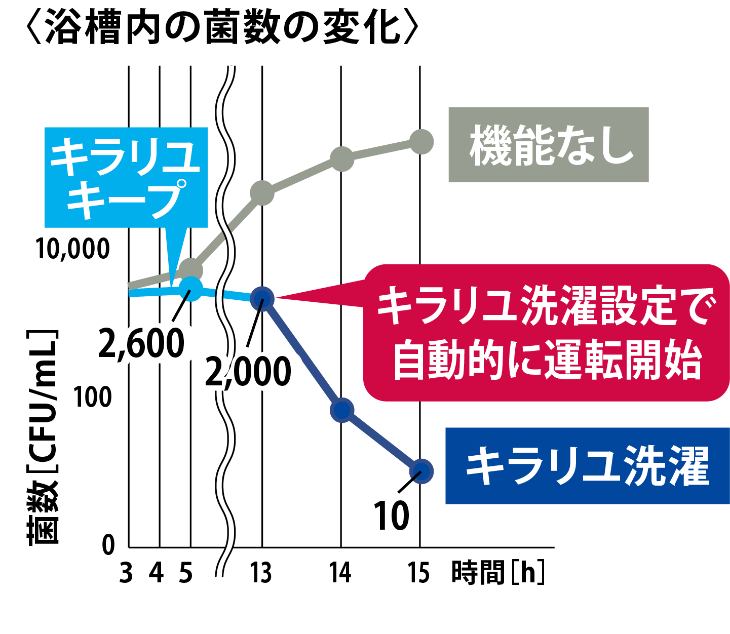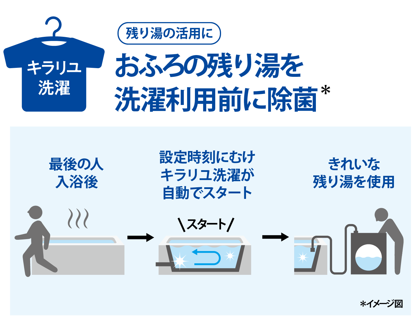 キラリユ洗濯は、洗濯利用前に合わせてお風呂の残り湯を除菌してきれいにする機能です。