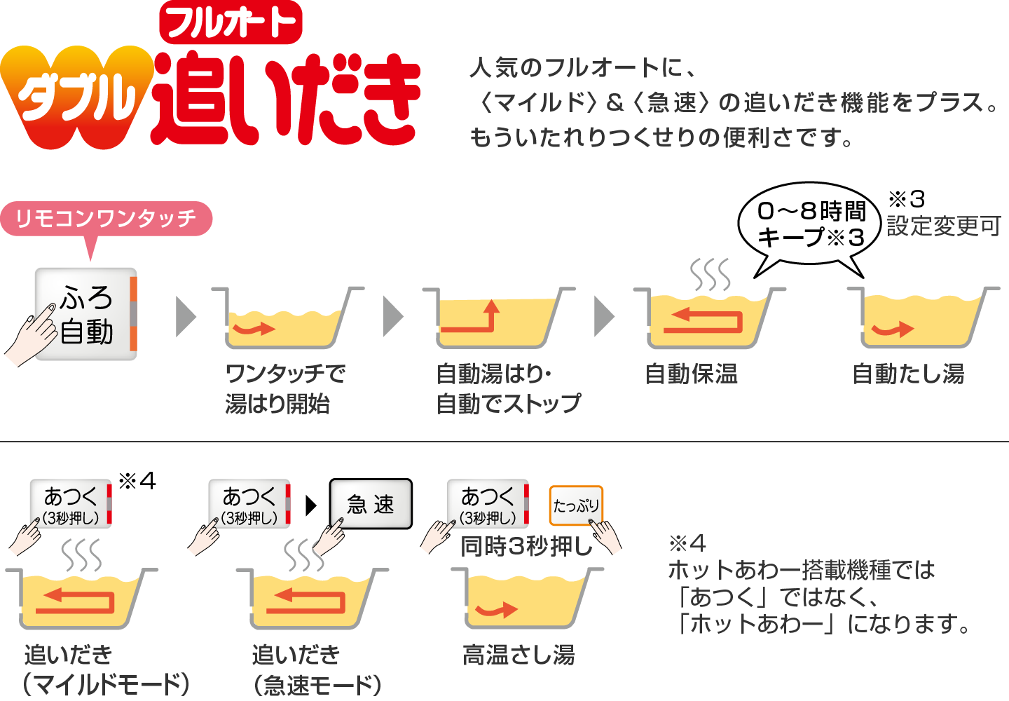 ワンタッチで自動湯はり・自動ストップ・自動保温・自動たし湯を行うふろ自動で人気のフルオートに、「マイルド」&「急速」の追いだき機能をプラスしたフルオートダブル追いだき。もういたれりつくせりの便利さです。
