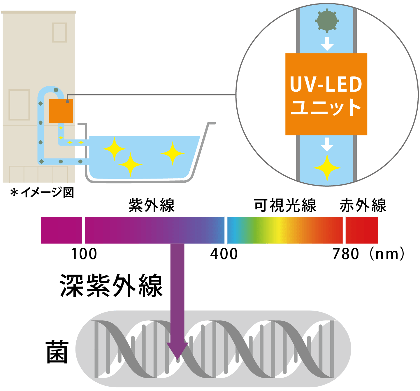 業界初*の深紫外線を採用したUV-LEDユニットを搭載。入浴中から入浴後まで清潔で快適!