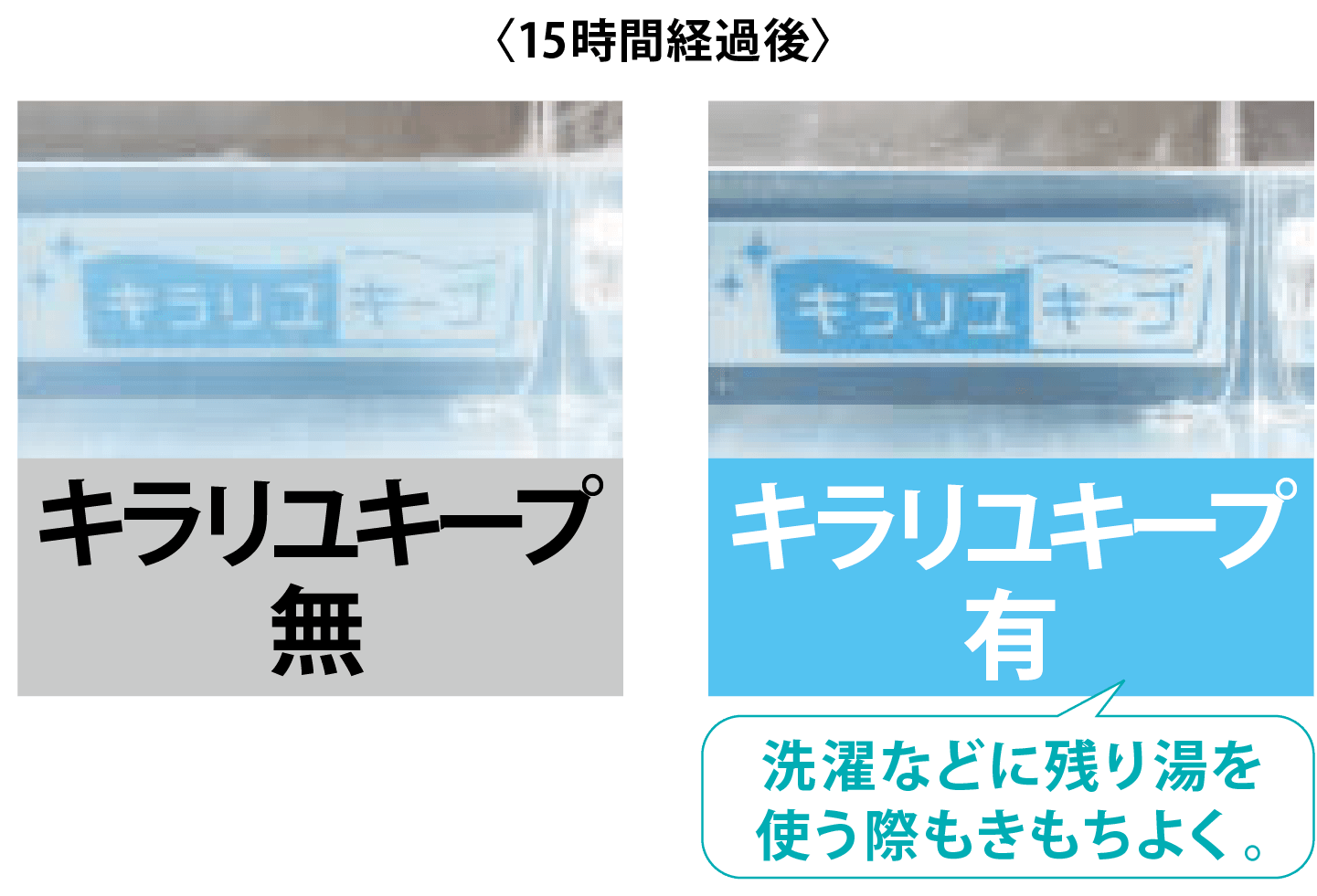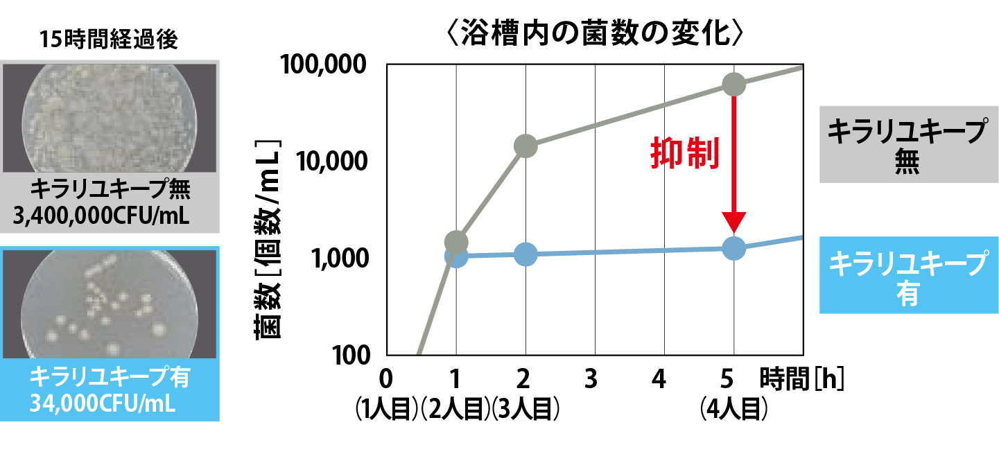 通常、時間経過とともに菌が増殖して臭いやにごりが発生してしまいますが、キラリユキープで菌の増殖を抑制します。きれいなお湯をキープして、最後の人まできもちよく入浴できます。洗濯に利用する残り湯もキレイな状態をキープできます。