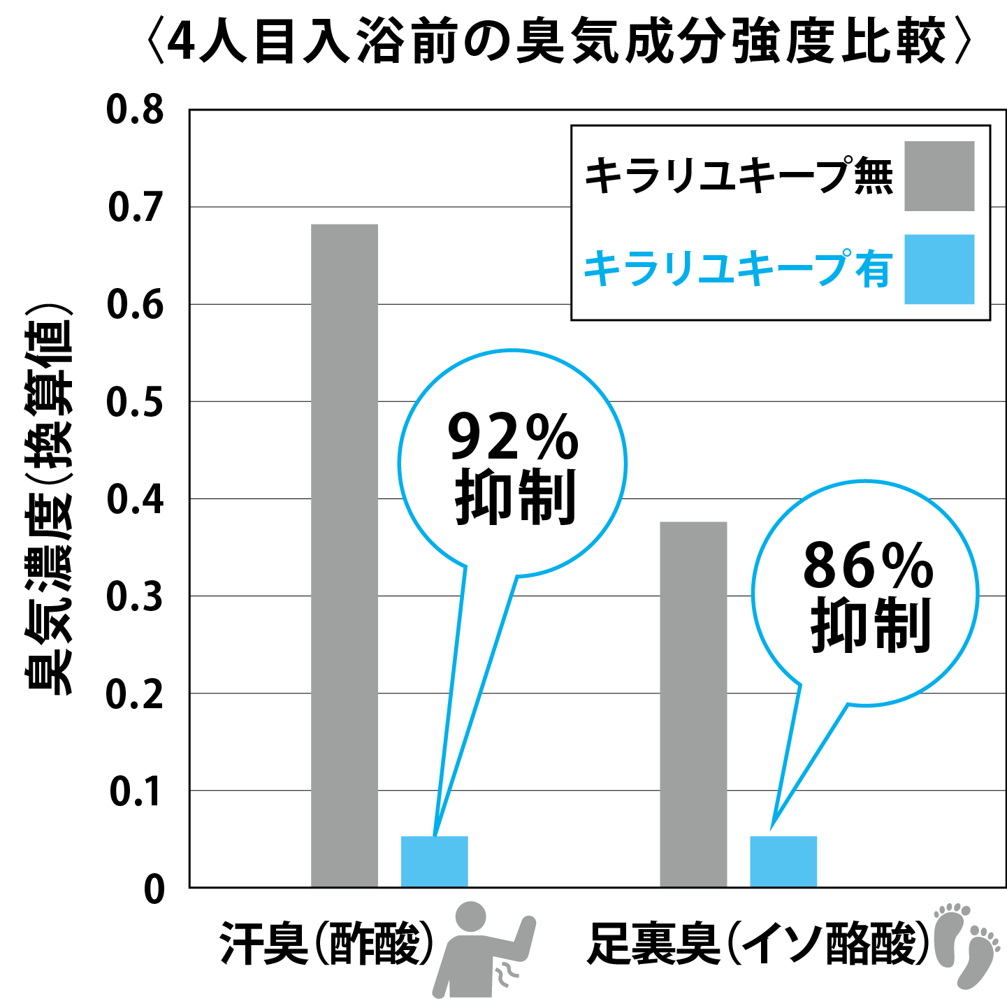 *2【試験方法】湯量180L、湯温40℃に4人目入浴前(1人目入浴から5時間後)の臭いをガスクロマトグラフィで評価