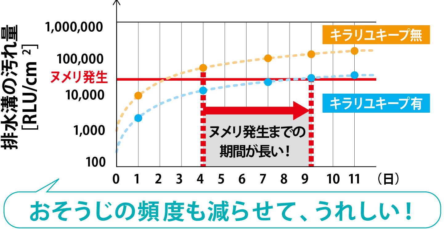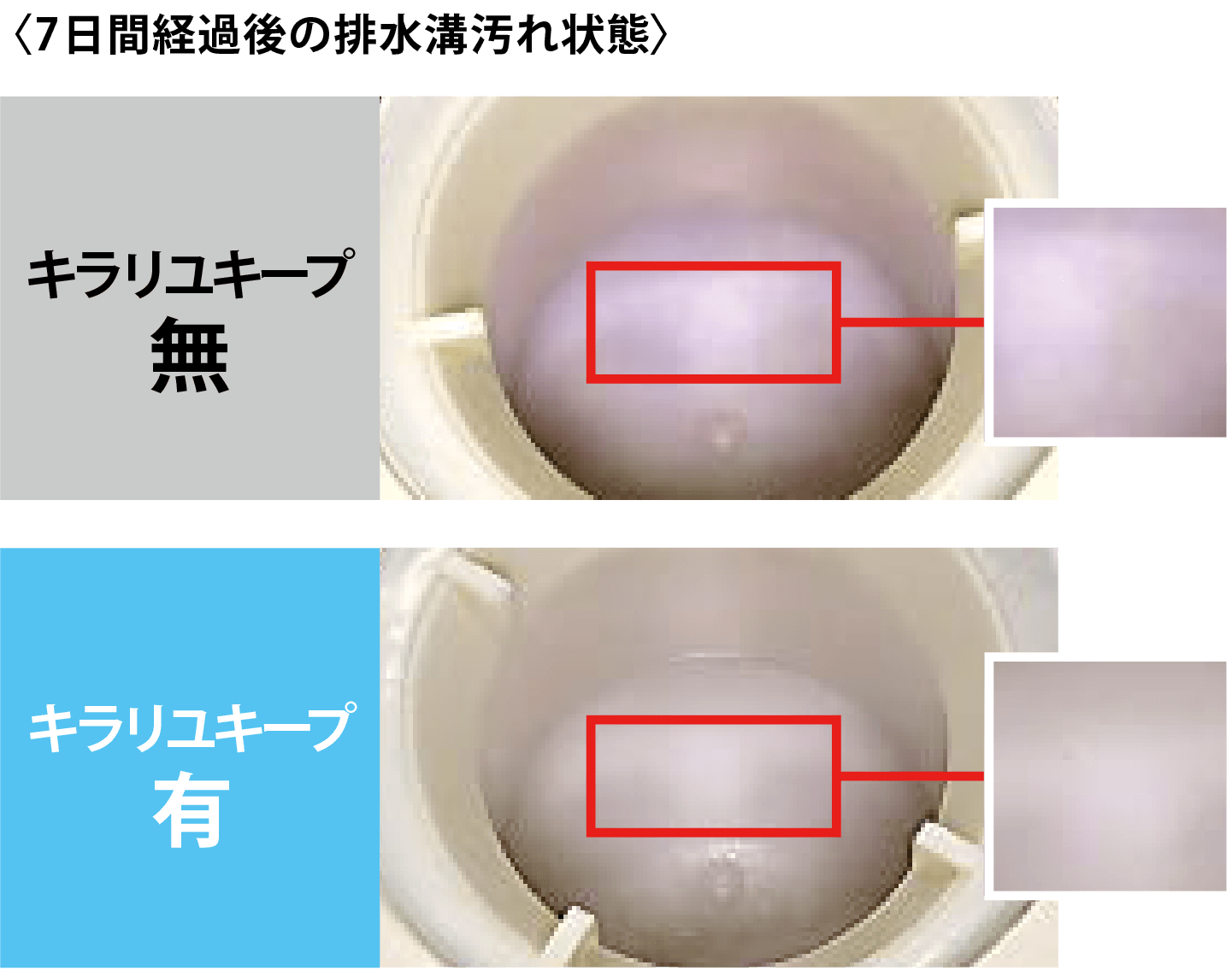 キラリユキープで菌の繁殖を抑えているため、排水溝に流れるお湯、溜まるお湯も菌の繁殖が抑制されます。7日間経過後の排水溝の汚れも発生しにくくなり、お手入れがかんたん!*1*2キラリユキープでヌメリの発生までの期間が2倍以上になり、おそうじがもっとラクになります。*3