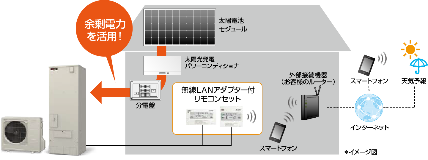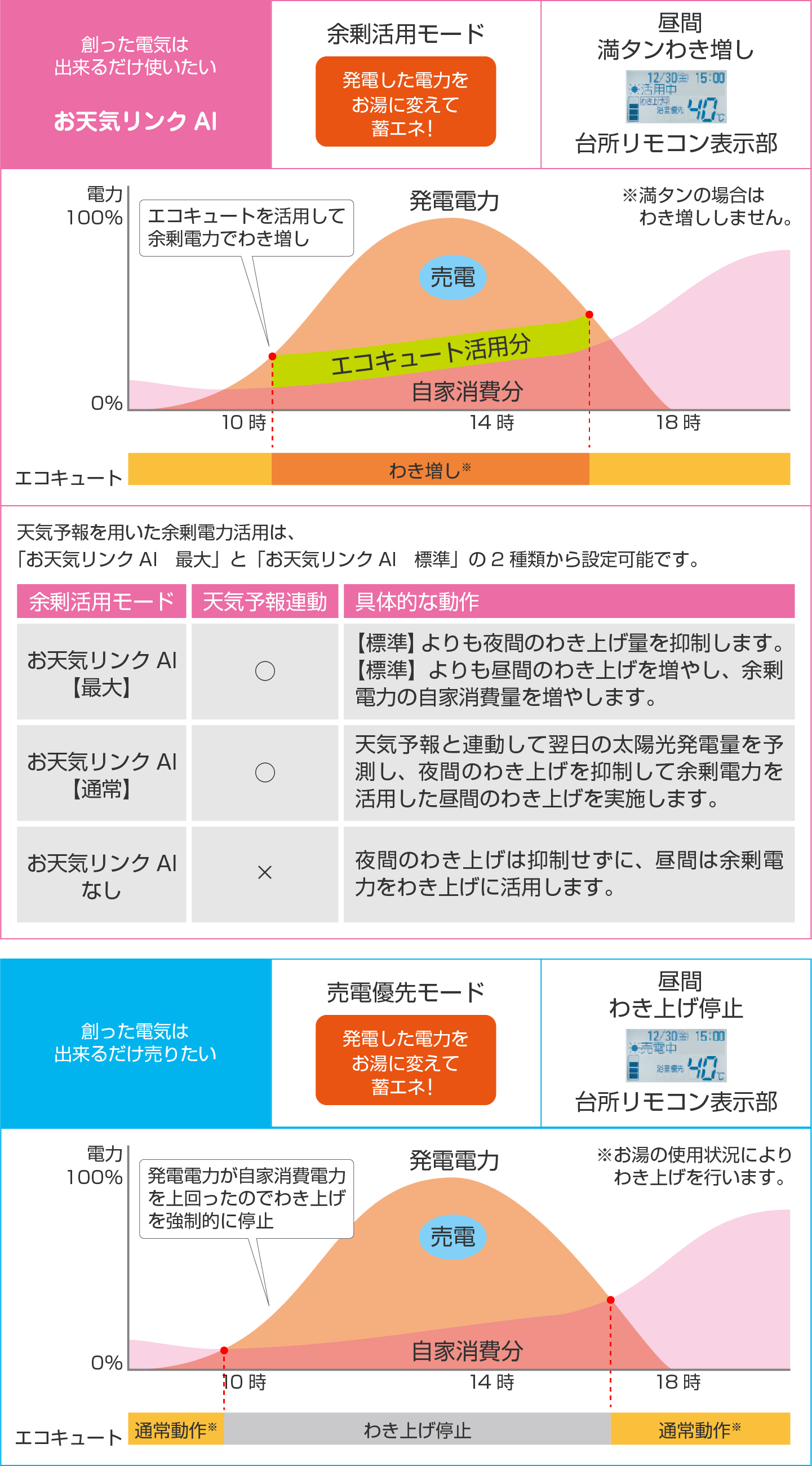 さまざまな家電製品をネットワークでつないでコントロールする三菱HEMSを活かし、太陽光発電システムとエコキュートのよりかしこい連携を可能にした機能です。天気予報と、過去の太陽光発電実績をもとに、翌日分のお湯の沸き上げに太陽光発電電力を使うかどうか自動で判断します。創った電気は出来るだけ使う「余剰活用モード」、創った電気は出来るだけ売る「売電優先モード」があり、日中も余剰電力でわき上げをしたり、自家消費電力が発電量を上回ったときはわき上げを止める等、沸き上げのタイミングを変えることで太陽光発電電力を上手に活用します。