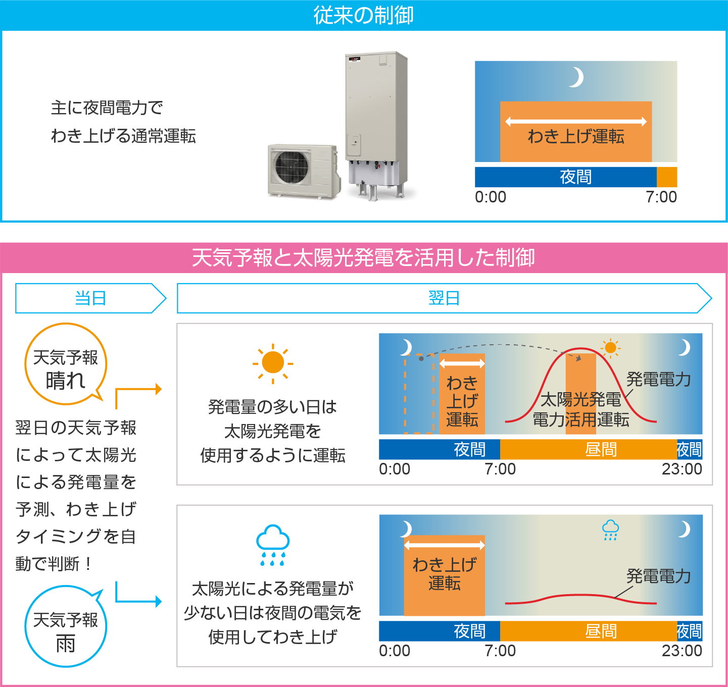 従来の制御方法では、電気代の安い深夜電力を利用する等をして、夜間の内にわき上げを行っていました。 天気予報と太陽光発電を活用したお天気リンクEZは、天気予報の情報を取得し、翌日の天気予報が晴れの予報ならば夜間のわき上げを減らし、日中に太陽光発電の余剰電力を併用してわき上げをおこないます。逆に雨の予報ならば今晩中にわき上げを行います。お天気リンクAI